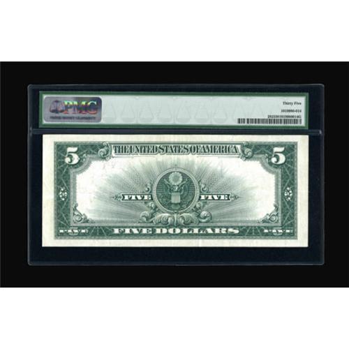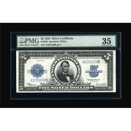 <B>Fr. 282 $5 1923 Silver Certificate PMG Choice Very Fine 35.</B></I> The colors look as good as those seen in higher grade examples. A well margined beauty in a most desirable grade that will be noticed.<BR><BR><b>Shipping:</b> Coins & Currency (<a target="_blank" href="http://www.heritageauctions.com/common/shipping.php">view shipping information</a>)