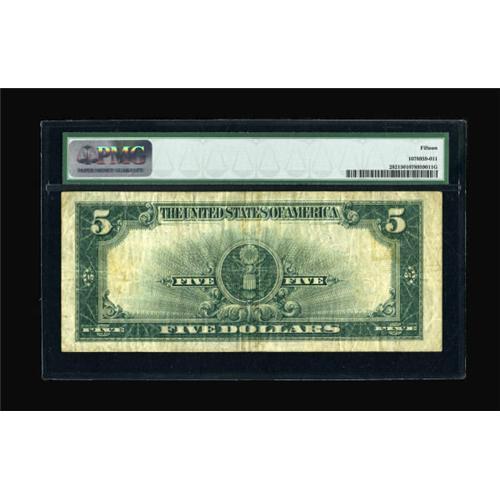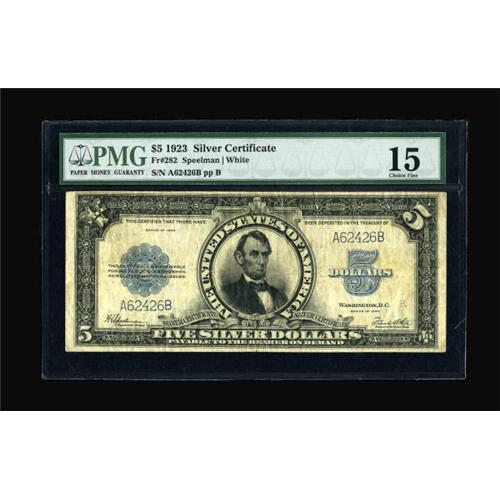 <B>Fr. 282 $5 1923 Silver Certificate PMG Choice Fine 15.</B></I> Five digit radar serial number A62426B is an added bonus on this pleasing Porthole that exhibits the usual circulation. Fancy numbers on large size notes are elusive especially in this series.<BR><BR><b>Shipping:</b> Coins & Currency (<a target="_blank" href="http://www.heritageauctions.com/common/shipping.php">view shipping information</a>)