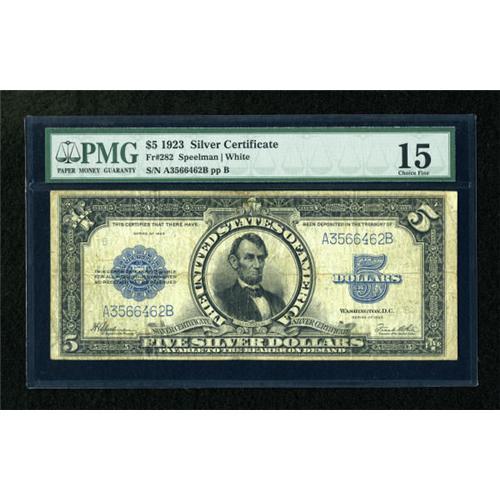 <B>Fr. 282 $5 1923 Silver Certificate PMG Choice Fine 15.</B></I> The usual issues seen for the grade are noticed on this Porthole.<BR><BR><b>Shipping:</b> Coins & Currency (<a target="_blank" href="http://www.heritageauctions.com/common/shipping.php">view shipping information</a>)