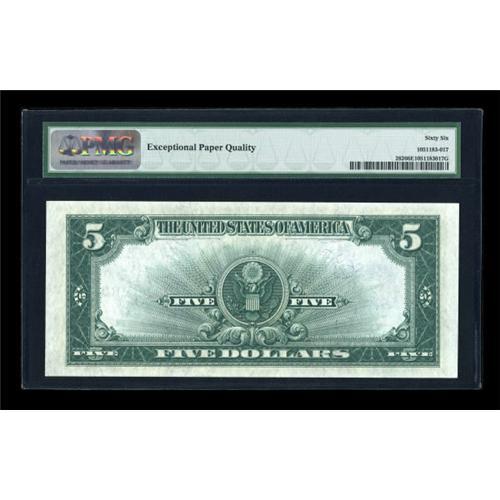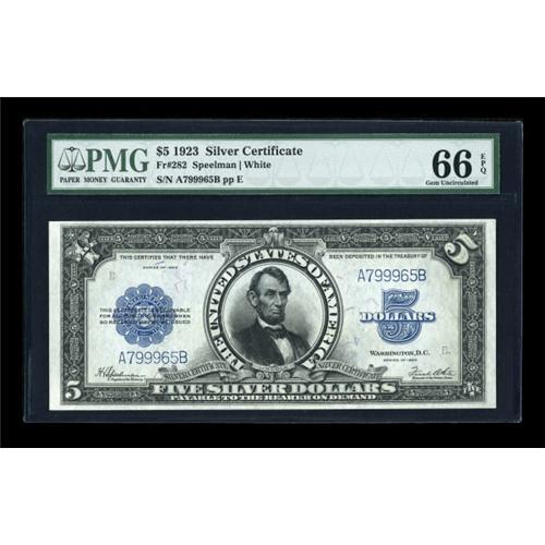 <B>Fr. 282 $5 1923 Silver Certificate PMG Gem Uncirculated 66 EPQ.</B></I> Here is a third near Superb example of this ever popular design offered this evening (as the first being offered earlier as part of the Peter Gamble Collection) that is wonderfully embossed and well inked. <BR><BR><b>Shipping:</b> Coins & Currency (<a target="_blank" href="http://www.heritageauctions.com/common/shipping.php">view shipping information</a>)