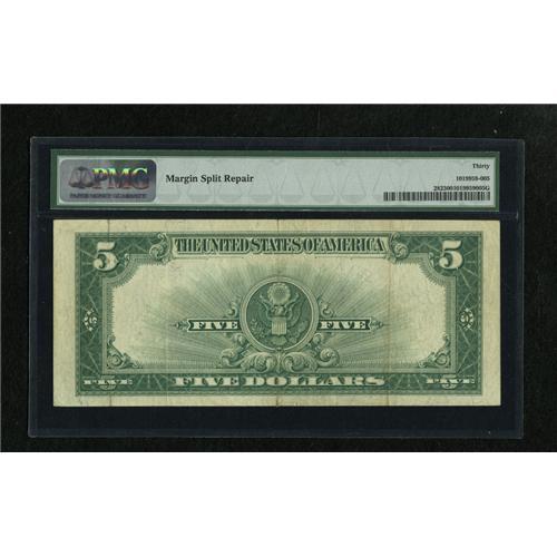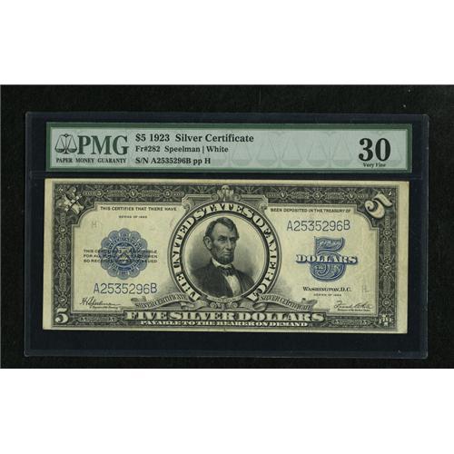 <B>Fr. 282 $5 1923 Silver Certificate PMG Very Fine 30.</B></I> This piece appears fully EF as there are really only three folds and minor handling that accounts for the grade. The margin reveals a minor professional repair.<BR><BR><b>Shipping:</b> Coins & Currency (<a target="_blank" href="http://www.heritageauctions.com/common/shipping.php">view shipping information</a>)
