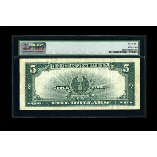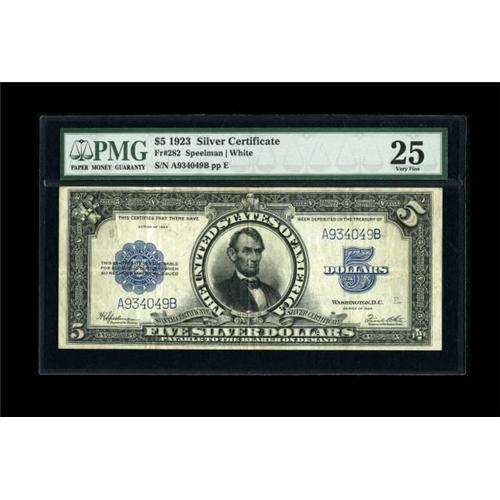 <B>Fr. 282 $5 1923 Silver Certificate PMG Very Fine 25.</B></I> This attractive Porthole has all the eye appeal of a high end VF, including a bold blue overprint and bright paper.<BR><BR><b>Shipping:</b> Coins & Currency (<a target="_blank" href="http://www.heritageauctions.com/common/shipping.php">view shipping information</a>)