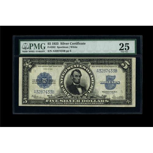 <B>Fr. 282 $5 1923 Silver Certificate PMG Very Fine 25.</B></I> The surfaces are bright on this pleasingly embossed Porthole.<BR><BR><b>Shipping:</b> Coins & Currency (<a target="_blank" href="http://www.heritageauctions.com/common/shipping.php">view shipping information</a>)