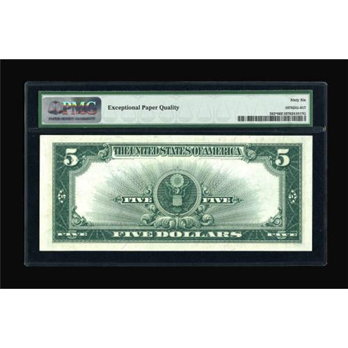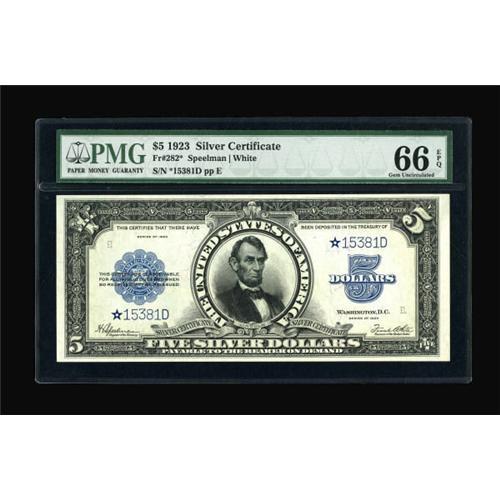 <B>Fr. 282 $5 1923 Silver Certificate Star Note PMG Gem Uncirculated 66 EPQ.</B></I> This is a drop dead gorgeous Porthole star, with virtually perfect centering on both sides, full originality, and boldly printed colors. It falls within the run of uncirculated examples that for years have provided collectors with the opportunity to own a gem example of this one year star type, and is as nice as any example we have ever had the pleasure of offering. With a recent auction record for a PCGS graded 67 Porthole star standing at $34,500, we think it very likely that this piece, which appears every bit its equal, will certainly realize...<BR><I>From The Warren Marshall Collection</B></I><BR><BR><b>Shipping:</b> Coins & Currency (<a target="_blank" href="http://www.heritageauctions.com/common/shipping.php">view shipping information</a>)