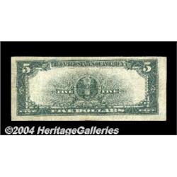Fr. 282 $5 1923 Silver Certificate Very Fine. There is a short tear at the right edge, but that is the only flaw in this attractive, perfectly natural Porthole Five. <BR><BR><B>Important notice:</B> Heritage usually auctions material at the rate of 200-250 lots per hour. On some occasions eBay Live bid software or the Internet may not be able to keep up with the pace of the auction. We recommend placing a realistic absentee bid now as insurance to avoid disappointment. Occasionally the auctioneer may eliminate or reject an eBay Live bid, and the auctioneer may also reopen a lot after the close of the eBay live bidding (usually because we missed an audience bid), and may reject your bid even if it shows you as the winning bidder. By bidding via eBay Live, you agree that Heritage may award the lot to another bidder at its sole discretion under the circumstances described above or any other reasonable circumstances. Since eBay bids are not shown to us until we open the lot on the floor, we treat those bids just like floor bids. In most cases the floor responds before the eBay bid is presented to us, due to Internet lag time, so for consistency we have made it a policy that floor bids are always considered first over tie eBay live bids. Also please note that all Heritage lots purchased through eBay Live carry a 20% Buyer's Premium. Please make sure you read the Terms and Conditions before you bid. <BR><BR><B>IMPORTANT ANNOUNCEMENT ABOUT RESERVES:</B> Heritage now divulges all reserves on its web site 7 days before every auction. If you want to know whether the reserve on this lot has been met, and if not, what the reserve amount is, please visit this lot page on the HeritageCoin.com web site, or email: bid@HeritageGalleries.com