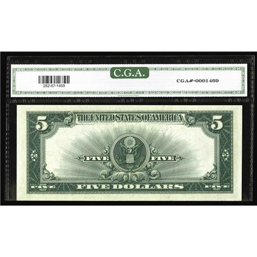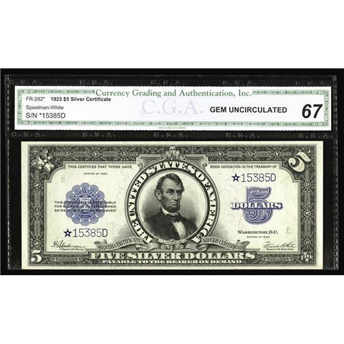 <B>Fr. 282* $5 1923 Silver Certificate Star CGA Gem Uncirculated 67.</B></I> This Star Porthole has huge margins all the way around, and perfect centering of both the face and back design. The deep, original embossing can be clearly seen through the CGA holder. Only 36 Porthole Stars are known, according to the new Murray reference.