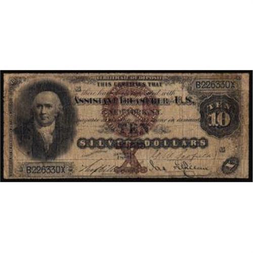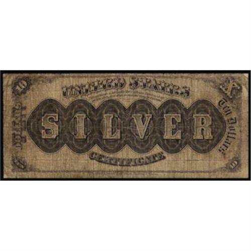 <style type="text/css"> body, td, th { font-family: Arial, Helvetica, sans-serif; font-size: 12px; color: #482424; margin: 0px; padding: 0px; } #header { background-image: url(http://www.bowersandmerena.com/ebay/images/template_v3_01.gif); clear: both; background-color: #590303; border-top-width: 2px; border-top-style: solid; border-top-color: #B38C4F;}#header #header_wrapper { height: 75px; clear: both; width: 800px; margin-right: auto; margin-left: auto; background-image: url(http://www.bowersandmerena.com/ebay/images/template_v3_03.gif); background-repeat: no-repeat; background-position: right; color: #F3EDCC;}#header #header_wrapper #header_logo { float: left; height: 75px; width: 444px; background-image: url(http://www.bowersandmerena.com/ebay/images/template_v3_02.gif); background-repeat: no-repeat; font-size: 10px; text-transform: capitalize; color: #B38C4F;}#header #header_wrapper #header_right { float: left; height: 75px; width: 356px; text-align: right;}#header #header_wrapper #header_right #headerLoginBtn { margin-bottom: 30px;}#header #header_wrapper #header_right input#txtSearch { color: #B49056; border: 1px solid #B49056; width: 175px; padding-top: 3px; padding-right: 3px; padding-bottom: 4px; padding-left: 3px;}#nav { height: 37px; background-image: url(http://www.bowersandmerena.com/ebay/images/template_v3_05.gif); clear: both;}#nav #nav_wrapper { height: 35px; width: 800px; margin-right: auto; margin-left: auto; border-left-width: 1px; border-left-style: solid; border-left-color: #B38C4F;}#nav #nav_wrapper a { padding-right: 15px; padding-left: 15px; border-right-width: 1px; border-right-style: solid; border-right-color: #B38C4F; height: 25px; padding-top: 10px; display: block; float: left; text-decoration: none; font-weight: bold; color: #5D0303;}#nav #nav_wrapper a:hover { color: #B38C4F;}#nav #nav_wrapper #search { float: right; padding-top: 7px;}#nav #nav_wrapper #search #txtSearch { font-family: Arial, Helvetica, sans-serif; font-size: 10px; text-transform: uppercase; color: #D2AE75; border: 1px solid #B38C4F; padding: 3px;}#content_bgd { background-image: url(http://www.bowersandmerena.com/ebay/images/template_v3_09.gif); background-repeat: repeat-y; background-position: center; padding-top: 15px; padding-bottom: 15px; background-color: #FBFBDB;}#content_wrapper { clear: both; height: auto; width: 800px; margin-right: auto; margin-left: auto;}.LotDetailWhite{ line-height:normal; font-size:13px; font-family: arial,helvetica,sans-serif; color: White; font-weight: bold;}.LotDetailInformation{ line-height:normal; font-size: 13px; font-family: arial,helvetica,sans-serif;}.LotDetailMessage{ line-height:normal; font-size: 13px; font-family: arial,helvetica,sans-serif; color: red;}}tr.HeaderAuctionTitle td { color: #000000; font-weight: bold; padding: 2px; background-image: url(http://www.bowersandmerena.com/ebay/images/template_v3_05.gif); background-repeat: repeat-x; border-bottom-width: 1px; border-bottom-style: solid; border-bottom-color: #B38C4F;}table.AuctionSummary a, table.AuctionSummary a:link, table.AuctionSummary a:visited { color: #0000FF; text-decoration: none;}}td.tableHeaderLeft { border-left-width: 1px; border-left-style: solid; border-left-color: #B38C4F;}td.tableHeaderRight { border-right-width: 1px; border-right-style: solid; border-right-color: #B38C4F;}td.tableCellMiddle { border-left-width: 1px; border-left-style: solid; border-left-color: #B38C4F; border-right-width: 1px; border-right-style: solid; border-right-color: #B38C4F; padding: 5px;}tr.footer td { border-top-width: 1px; border-top-style: solid; border-top-color: #B38C4F;}</style></head><body><div id="header"> <div id="header_wrapper"> <div id="header_logo"> </div> <div id="header_right"> </div> </div></div><div id="nav"> <div id="nav_wrapper"> <a href="http://www.bowersandmerena.com">Our eBayLive Auctions</a> <a href="#PaymentInfo">Payment Information</a> <a href="#ShippingInfo">Shipping Information</a> <a href="#About">About Bowers and Merena</a> </div></div><div id="content_bgd"> <div id="content_wrapper"> <table width="100%" border="0" cellpadding="5" cellspacing="0" class="AuctionSummary"> <tbody> <tr class="HeaderAuctionTitle" style="height: 25px;"> <td align="left" class="tableHeaderLeft" > </td> <td align="center" class="tableHeaderRight"> <span style="font-size: large;">Lot #83. Fr. 286. 1880 $10 Silver Certificate. PMG Very Good 8.</span> </td> </tr> <tr> <td colspan="3" class="tableCellMiddle"> A very scarce number, with a census of just 16 examples traced by serial number. Only two have been certified by PMG, this and another slightly better that garnered a "10". These countersigned notes seldom appear on the market and when they do, considerable bidder interest is always forthcoming. We sold a VG of this number in our November 2002 auction for $4,140 and expect tonight's realization to at least approach that. Est. $3,000 - $4,500