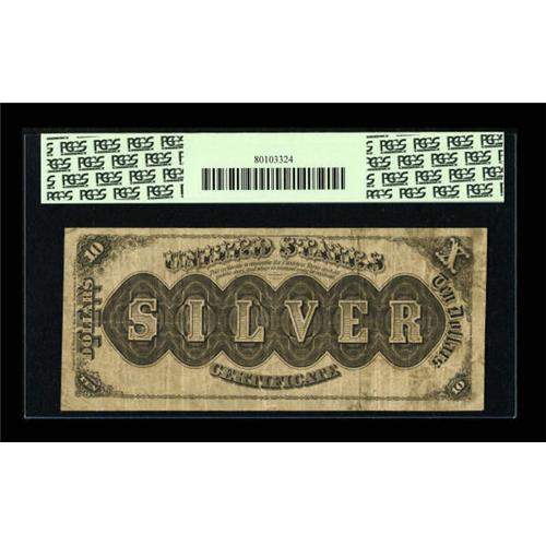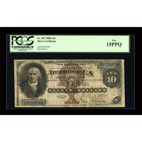 <B>Fr. 287 $10 1880 Silver Certificate PCGS Fine 15PPQ.</B></I> This is an evenly circulated example that has nice edges and paper for the grade. This would be an excellent choice for a type collection.<BR><I>From The Kansas City Collection.</B></I><BR><BR><b>Shipping:</b> Coins & Currency (<a target="_blank" href="http://www.heritageauctions.com/common/shipping.php">view shipping information</a>)