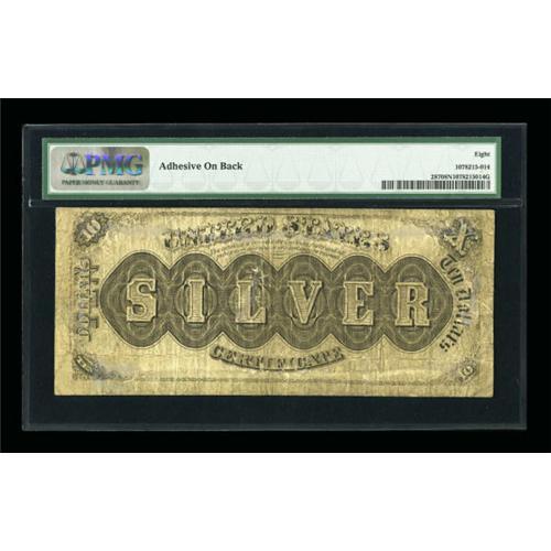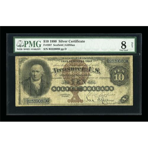 <B>Fr. 287 $10 1880 Silver Certificate PMG Very Good 8 Net.</B></I> Some adhesive remnants from mounting have been repaired on this Robert Morris $10 that faces up nicely. A popular type note which should find a new home this evening.<BR><BR><b>Shipping:</b> Coins & Currency (<a target="_blank" href="http://www.heritageauctions.com/common/shipping.php">view shipping information</a>)