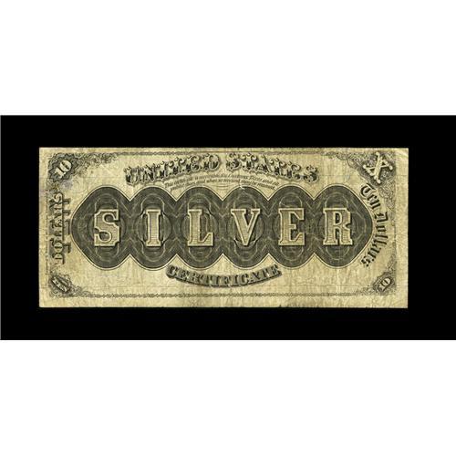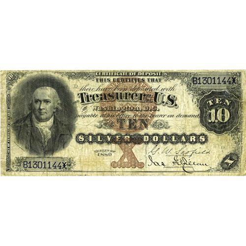 <B>Fr. 287 $10 1880 Silver Certificate Very Good.</B></I> This newcomer to the known population retains much color. A couple of pinholes and a well executed repair at right do little to distract.