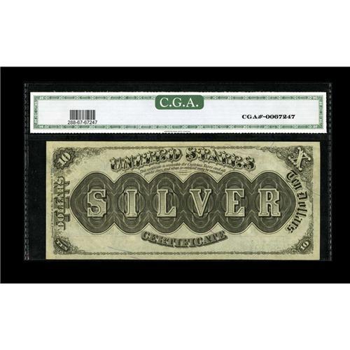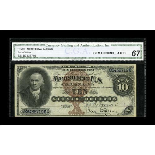 <B>Fr. 288 $10 1880 Silver Certificate CGA Gem Uncirculated 67.</B></I> This $10 is from the run that has supplied all of the really nice examples of this Friedberg number. This one shares the paper originality with the other notes from that group, but it has far better margins than most of the other examples we've seen. It's also beautifully centered on both sides, with absolutely perfect color of the inks and paper. Added to that, this piece has a greater-than-normal scattering of bright red and blue anticounterfeiting silk fibers, which help to impart a colorful and striking appearance to this high-graded piece. A repaired pinhole is found in the extreme lower right-hand corner tip.<BR><BR><b>Shipping:</b> Coin/Currency (<a target="_blank" href="http://www.heritageauctions.com/common/shipping.php">view shipping information</a>)