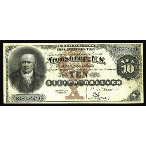 <B>Fr. 289 $10 1880 Silver Certificate Choice Very Fine.</B></I> Beautifully margined, with excellent colors. Its only defect is one small central pinhole and slightly soft paper surfaces. A very attractive piece.