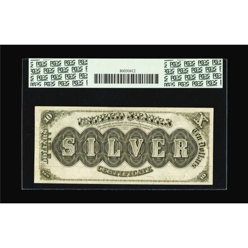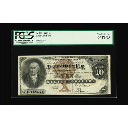 <B>Fr. 289 $10 1880 Silver Certificate PCGS Very Choice New 64PPQ.</B></I> For over 25 years this example has remained locked away. We are fortunate to be able to bring this beauty to you ensconced within its holder looking as it has for over a century. It was last sold on a fixed pricelist for $3500. Expect today's price to be considerably more as the true rarity and desirability of our country's fiscal documents are beginning to finally get their due respect. This marks only the fourth new Morris note we have handled in one of our Heritage auctions. A minor amount of handling is seen at right on simply pristine, original surfaces.