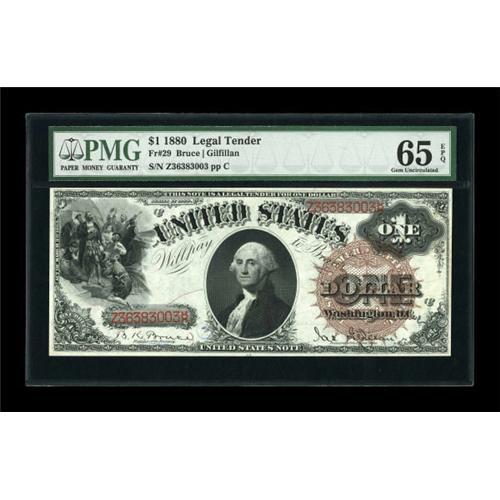 <B>Fr. 29 $1 1880 Legal Tender PMG Gem Uncirculated 65 EPQ.</B></I> Seal embossing is readily apparent on this wonderfully inked ace with deep color.<BR><BR><b>Shipping:</b> Coins & Currency (<a target="_blank" href="http://www.heritageauctions.com/common/shipping.php">view shipping information</a>)