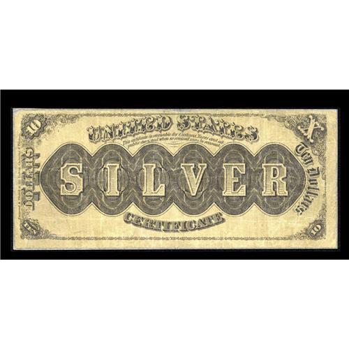 <B>Fr. 290 $10 1880 Silver Certificate Very Fine.</B></I> We sold this very note in our 1996 Florida United Numismatists auction, where it went for $440, a figure it will handily surpass tonight. Silked, in the style of notes which are <I>Ex-Farouk,</B></I> and with a tiny chip in the top margin.