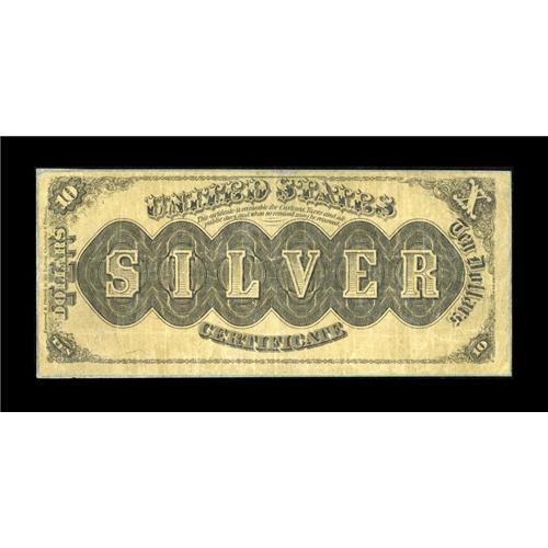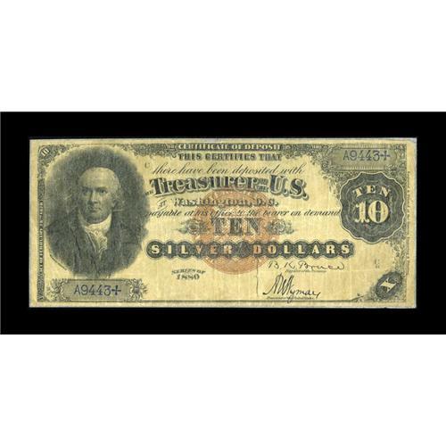 <B>Fr. 290 $10 1880 Silver Certificate Very Fine.</B></I> When we last sold this note in April 2006, we used the following description, "We sold this very note in our 1996 Florida United Numismatists auction, where it went for $440, a figure it will handily surpass tonight. Silked, in the style of notes which are <I>ex-Farouk,</B></I> and with a tiny chip in the top margin." It did indeed well surpass that figure, realizing $2,990. It should do about that well again.<BR><I>From The Collection of Greg Southward</B></I><BR><BR><b>Shipping:</b> Coins & Currency (<a target="_blank" href="http://www.heritageauctions.com/common/shipping.php">view shipping information</a>)