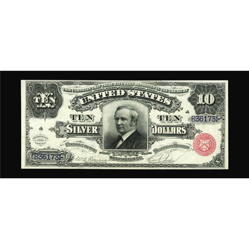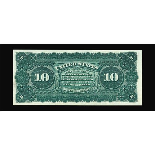 <B>Fr. 291 $10 1886 Silver Certificate Choice About New.</B></I> As with most of the Plymouth Rock collection notes, this piece is new to the census, bringing the total known just past the 20 mark. This note is one of the better ones, there are only four uncirculated pieces known, one of which is in the Smithsonian. This piece is just a single light fold away from the Choice New grade. A lovely example of a very scarce and popular type.<BR><I>From The Plymouth Rock Collection</B></I>