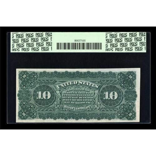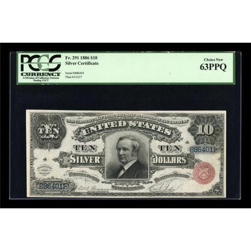 <B>Fr. 291 $10 1886 Silver Certificate PCGS Choice New 63PPQ.</B></I> Only twenty one serial numbers are enumerated in the census. This most pleasing Choice New example is the only uncirculated example to appear at auction since 2005 and is one of only three Uncirculated issues known. The margins are solid, though a touch slim at bottom and the paper is pleasingly original.<BR><BR><b>Shipping:</b> Coins & Currency (<a target="_blank" href="http://www.heritageauctions.com/common/shipping.php">view shipping information</a>)