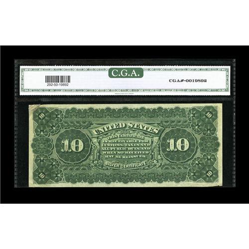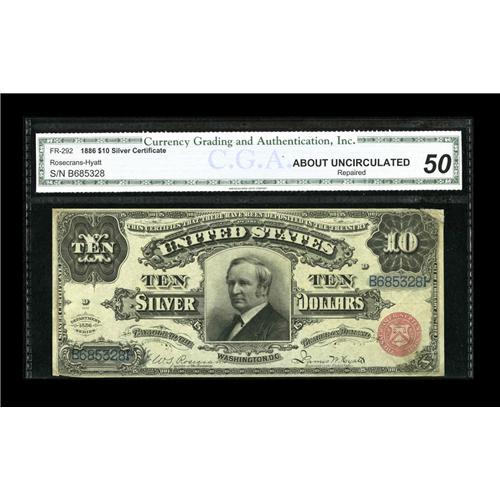 <B>Fr. 292 $10 1886 Silver Certificate CGA About Uncirculated 50 Repaired.</B></I> A decent appearing Tombstone, particularly if held so that your thumb covers the upper right-hand corner, which has been rather crudely restored. A tough type and with a considerable amount of value remaining. Cut out of its holder and properly re-restored, this could easily be a $3,000 note. As it lays, we would guess...
