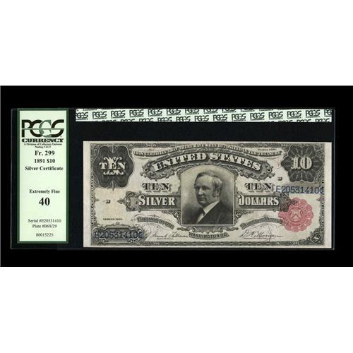 <B>Fr. 299 $10 1891 Silver Certificate PCGS Extremely Fine 40.</B></I> A bit tight across the top, but with strong colors.