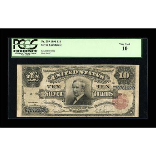 <B>Fr. 299 $10 1891 Silver Certificate PCGS Very Good 10.</B></I> Solid margins and decent paper are noted on this Tombstone.<BR><I>From The Kansas City Collection.</B></I><BR><BR><b>Shipping:</b> Coins & Currency (<a target="_blank" href="http://www.heritageauctions.com/common/shipping.php">view shipping information</a>)