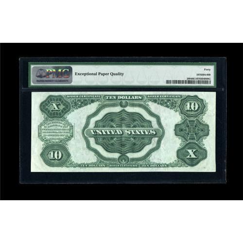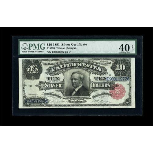 <B>Fr. 299 $10 1891 Silver Certificate PMG Extremely Fine 40 EPQ.</B></I> This Tombstone is blessed with extra large side margins, though it is a touch tight along the top at right. Some embossing is noticed along with a couple of faint folds, but it is still a colorful example with plenty of eye appeal.<BR><BR><b>Shipping:</b> Coins & Currency (<a target="_blank" href="http://www.heritageauctions.com/common/shipping.php">view shipping information</a>)