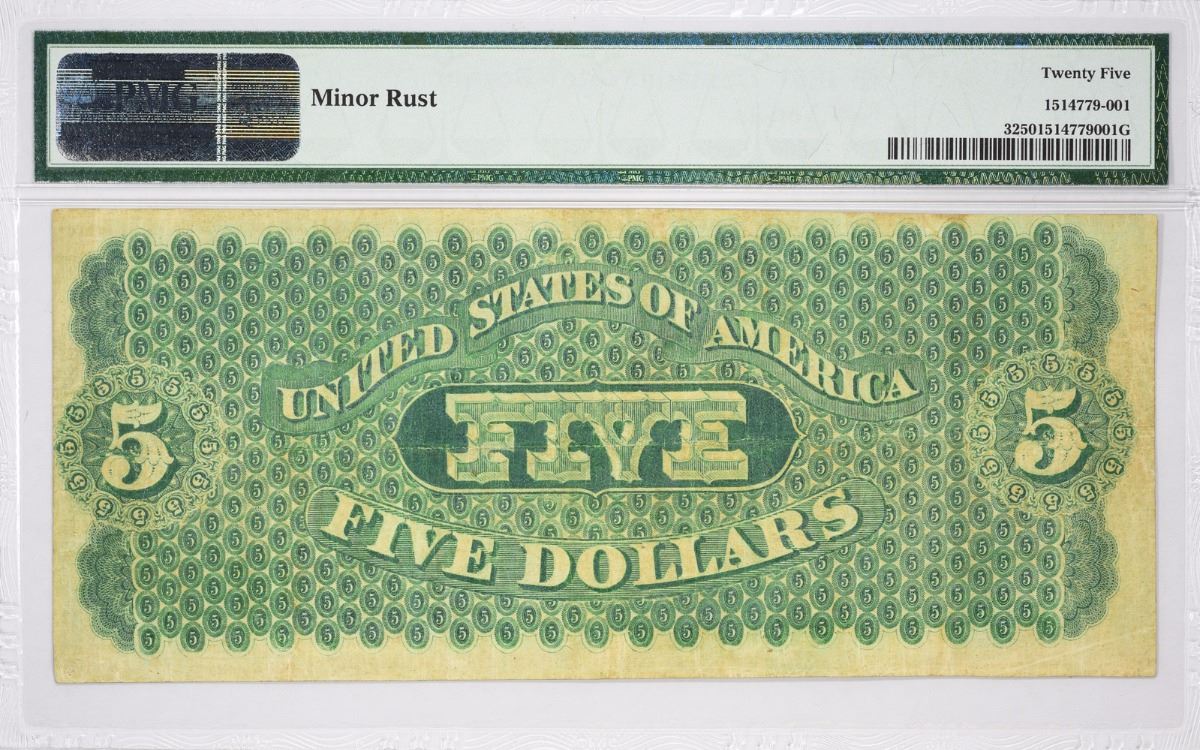 Locating attractive mid-grade examples of these early “Green Backs,” is always difficult and further more when offered without restoration. This Boston example is just that with just even circulation present and still deep green color of the central protector and counter. Strong penned signatures remain and nice detail of the important back design will be welcomed by collectors. PMG mentions “Minor Rust,” in the comments section of the holder which is so trivial that we cannot determine the exact location.