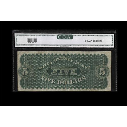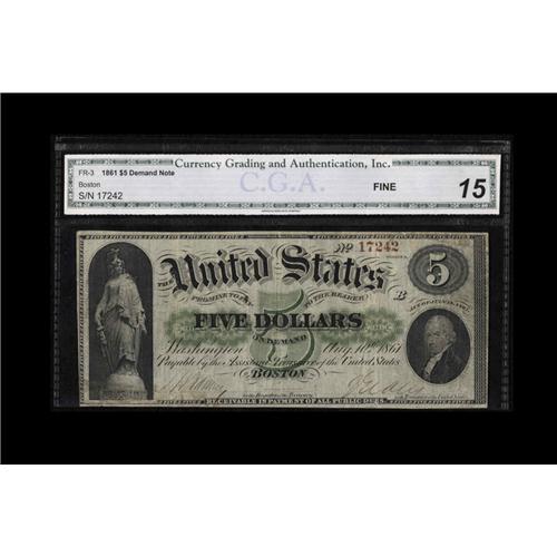 <B>Fr. 3 $5 1861 Demand Note CGA Fine 15.</B></I> But for a few inconsequential pinholes, this Boston Demand Note is an extremely nice example of the grade. The margins are far broader than normal, and the note has bold hand signatures.<BR><I>From The Ross Bailey Collection</B></I>