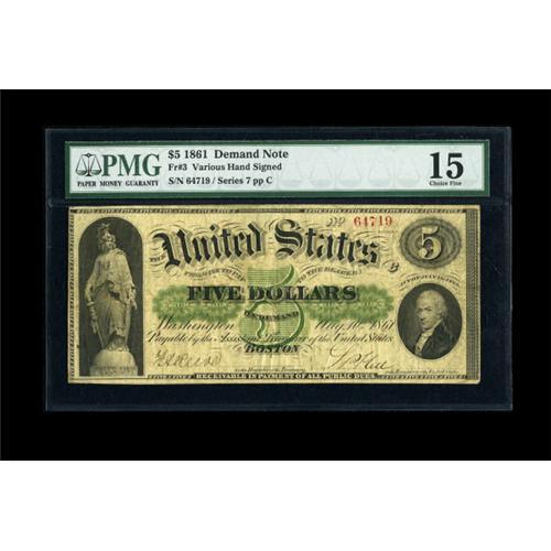 <B>Fr. 3 $5 1861 Demand Note PMG Choice Fine 15.</B></I> Nice colors and strong signatures remain on this evenly circulated example from Boston. After tonight the census number will increase by a couple. <BR><BR><B>Coin Engraver:</B> Victor D. Brenner<BR><BR><b>Shipping:</b> Coins & Currency (<a target="_blank" href="http://www.heritageauctions.com/common/shipping.php">view shipping information</a>)