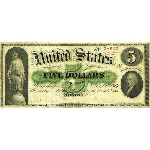 <B>Fr. 3 $5 1861 Demand Note Very Good.</B></I> This pleasing Demand Note was last offered for public sale in 1984. The paper is a touch soft and the signatures are partially remaining, though most importantly, the design details are still bold. A couple margin nicks are seen, but do not interrupt the integrity of the note.