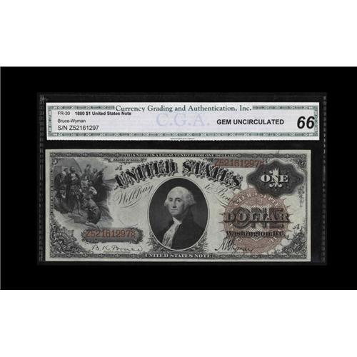 <B>Fr. 30 $1 1880 Legal Tender CGA Gem Uncirculated 66.</B></I> Broadly margined, with beautiful colors and patently original embossing visible through the third-party encapsulation.
