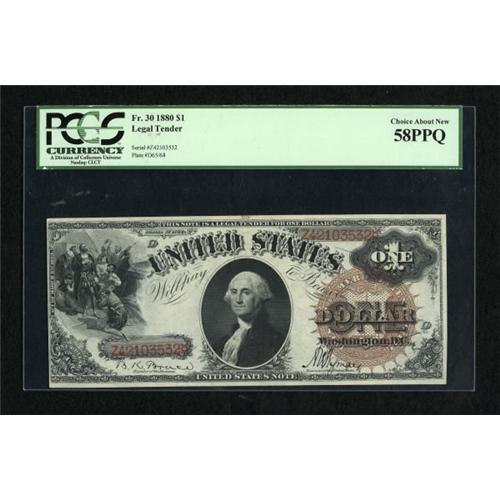 <B>Fr. 30 $1 1880 Legal Tender PCGS Choice About New 58PPQ.</B></I> The grade limiting fold or handling is not readily apparent on this attractive and otherwise New note. A partial plate number is noted in the top margin which is solid and evenly matched with the bottom.<BR><BR><b>Shipping:</b> Coins & Currency (<a target="_blank" href="http://www.heritageauctions.com/common/shipping.php">view shipping information</a>)