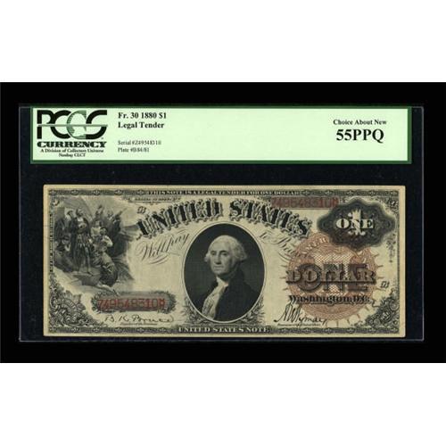 <B>Fr. 30 $1 1880 Legal Tender PCGS Choice About New 55PPQ.</B></I> Embossing of the design elements, including the seal and serial numbers, is visible on the back of the note.<BR><I>From The Kansas City Collection.</B></I><BR><BR><b>Shipping:</b> Coins & Currency (<a target="_blank" href="http://www.heritageauctions.com/common/shipping.php">view shipping information</a>)