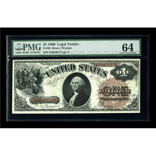 <B>Fr. 30 $1 1880 Legal Tender PMG Choice Uncirculated 64.</B></I> This 1880 Ace has bold ink color and primarily broad margins.<BR><BR><b>Shipping:</b> Coins & Currency (<a target="_blank" href="http://www.heritageauctions.com/common/shipping.php">view shipping information</a>)