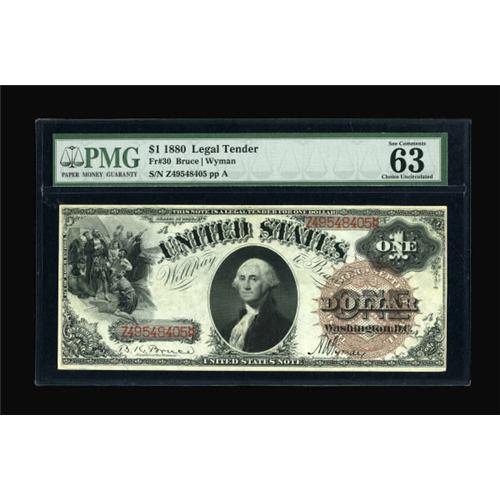 <B>Fr. 30 $1 1880 Legal Tender PMG Choice Uncirculated 63 EPQ.</B></I> Great color is noticed on this strongly embossed note.<BR><BR><b>Shipping:</b> Coins & Currency (<a target="_blank" href="http://www.heritageauctions.com/common/shipping.php">view shipping information</a>)