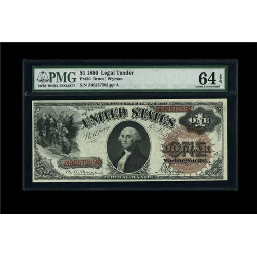 <B>Fr. 30 $1 1880 Legal Tender PMG Choice Uncirculated 64 EPQ.</B></I> Plenty of embossing is noticed on this Ace that has three ample margins. The colors and paper are excellent.<BR><BR><b>Shipping:</b> Coins & Currency (<a target="_blank" href="http://www.heritageauctions.com/common/shipping.php">view shipping information</a>)