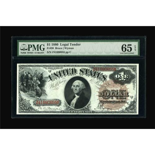<B>Fr. 30 $1 1880 Legal Tender PMG Gem Uncirculated 65 EPQ.</B></I> Broad margins complement the wonderful color this deeply inked note possesses. Sure to impress, so expect a hammer price in the range of...<BR><BR><b>Shipping:</b> Coins & Currency (<a target="_blank" href="http://www.heritageauctions.com/common/shipping.php">view shipping information</a>)