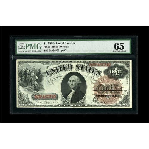 <B>Fr. 30 $1 1880 Legal Tender PMG Gem Uncirculated 65.</B></I> Embossing and natural paper wave adorn this lovely Ace.<BR><BR><b>Shipping:</b> Coins & Currency (<a target="_blank" href="http://www.heritageauctions.com/common/shipping.php">view shipping information</a>)