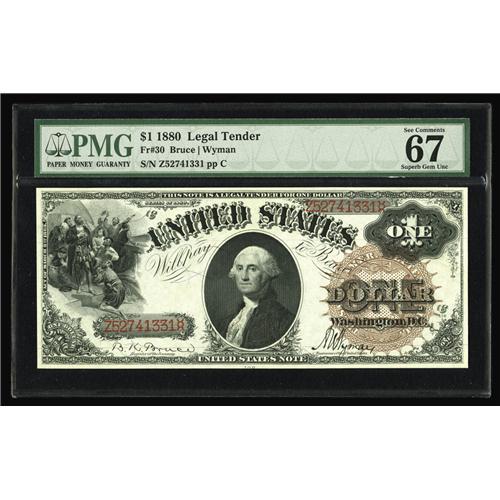 <B>Fr. 30 $1 1880 Legal Tender PMG Superb Gem Unc 67.</B></I> "Exceptional Paper Quality" is the PMG comment on this high-end, Large Brown Seal 1880 Ace.