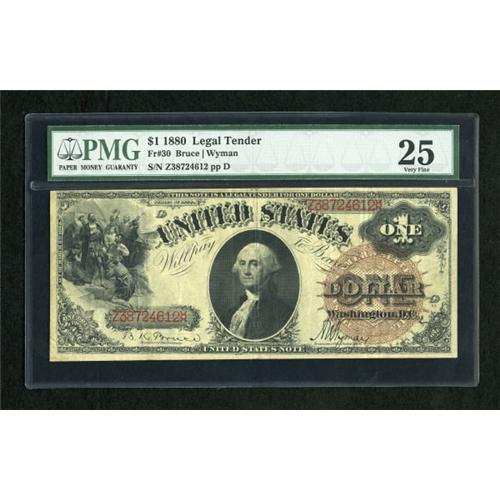 <B>Fr. 30 $1 1880 Legal Tender PMG Very Fine 25.</B></I> Decent margins and a boldly printed details are noted on this Ace. The seal is bright and complements the strong serial numbers.<BR><BR><b>Shipping:</b> Coins & Currency (<a target="_blank" href="http://www.heritageauctions.com/common/shipping.php">view shipping information</a>)