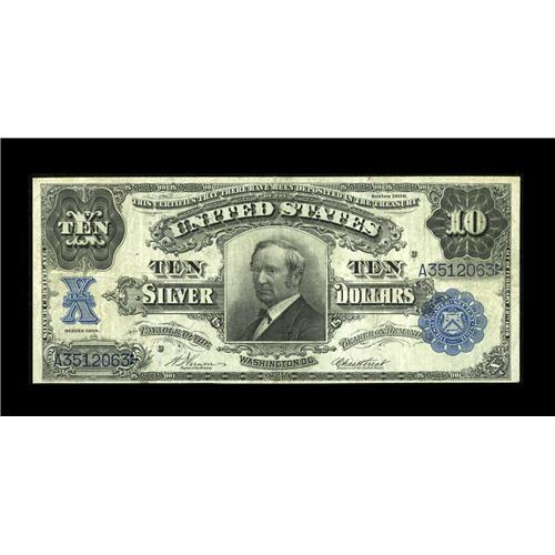 <B>Fr. 302 $10 1908 Silver Certificate Fine-Very Fine.</B></I> This Tombstone retains strong colors. A tiny margin tear at top has been repaired. Also, a couple of pinholes are seen at left.<BR><BR><b>Shipping:</b> Coin/Currency (<a target="_blank" href="http://www.heritageauctions.com/common/shipping.php">view shipping information</a>)