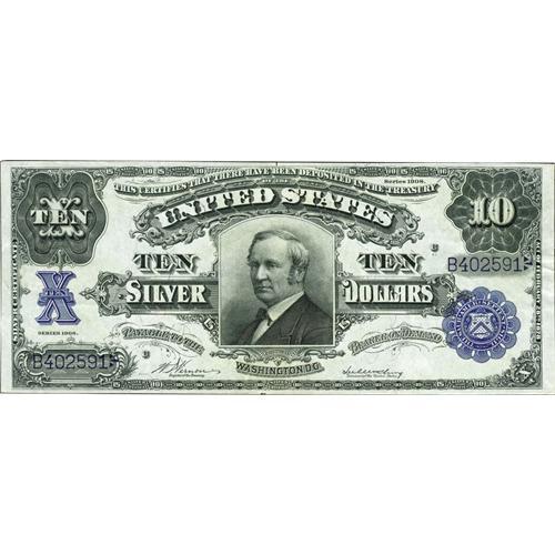 <B>Fr. 303 $10 1908 Silver Certificate Extremely Fine.</B></I> An attractive example which is bright, well centered, and ideal for the grade. It's been off the market since it last appeared in our University of Missouri collection sale in November of 1992, where it brought all of $495. Expect a somewhat higher realization this evening.