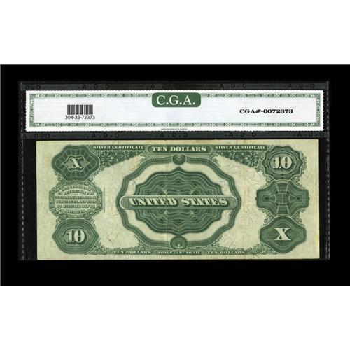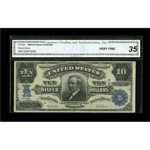 <B>Fr. 304 $10 1908 Silver Certificate CGA Very Fine 35.</B></I> A few folds can be seen through the holder on this rather nice looking Blue Seal Tombstone.