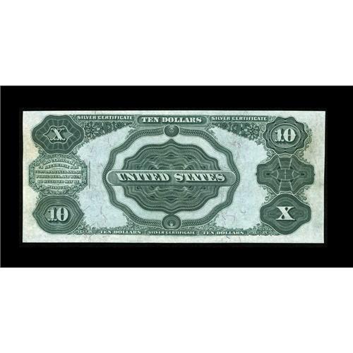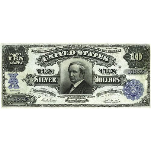 <B>Fr. 304 $10 1908 Silver Certificate Choice New.</B></I> An amply-margined example of this popular Blue Seal Tombstone. The type acquired its moniker on account of the portrait of Thomas Hendricks's appearing in a tombstone-shaped frame. The design of this note was originally introduced on the 1886 Series notes shortly after Vice President Hendricks passed away in office on November 25, 1885.<BR><I>From The Plymouth Rock Collection</B></I>