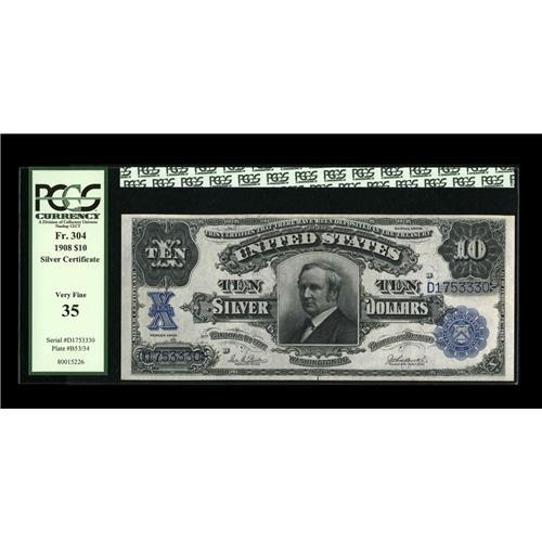 <B>Fr. 304 $10 1908 Silver Certificate PCGS Very Fine 35.</B></I> Very well margined, with bright colors. A really pretty Blue Seal Tombstone.