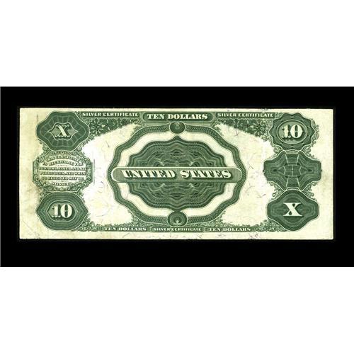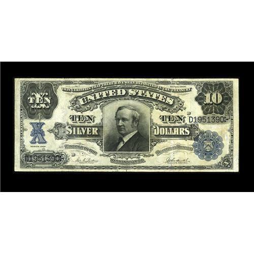 <B>Fr. 304 $10 1908 Silver Certificate Very Fine+.</B></I> This crisp example has survived numerous restoration encounters such as a repaired tear well into the design.