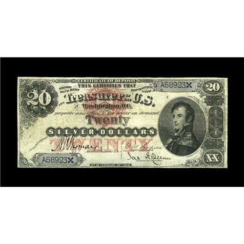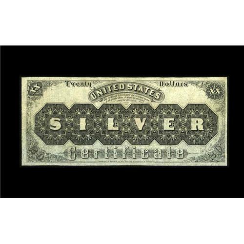 <B>Fr. 307 $20 1878 Silver Certificate Fine-Very Fine.</B></I> Only the fourth example of this number that CAA has offered, and we've had none since 1999. Only fifteen examples are known, four of which are permanently impounded in museum or Federal Reserve Bank hands. No uncirculated examples exist, and the high-grade pieces are two AU's and an XF. This note has excellent color, small but decent margins all the way around, and no visible problems. It has a masterfully repaired, virtually undetectable tear, and some blank paper has been replaced in the bottom margin, again, undetectable to all but the most expert of scrutiny. The note has the full visual impact and eye appeal of a Very Fine. Triple signature Twenties almost never reach the market, and this attractive example is likely to be hotly contested when it crosses the block tonight.
