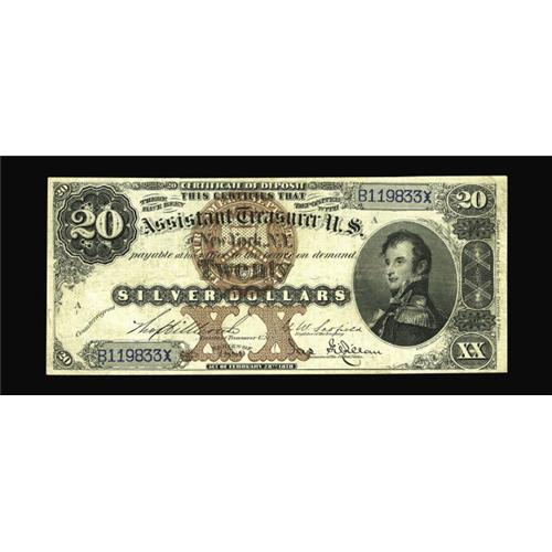 <B>Fr. 308 $20 1880 Silver Certificate Very Fine.</B></I> This note last sold in our FUN 2005 and was cataloged as follows, "This note from the Trask Collection brings the number of known 308's up to ten, none of which grade higher than XF. CAA has sold only four examples, including one of the Extra Fines, which realized $30,800 in January 1998, and a Fine which realized $20,900 in January 1999. This note falls right between those two in grade. It's a solid VF, without a hint of a repair, restoration or problem of any kind. The face is beautifully well margined, with perfect color. The back design also has perfect color, but it's centered a bit low, although it is clear of the edge. Fr. 308 is the only 1880 Twenty Dollar Silver with the triple signatures. It's also the only triple-signature Twenty with the Large Brown Seal and the Large Brown roman numeral XX. It's a distinct one-number type, and this beautiful example deserves considerable bidder attention." It realized $17,825 then, surely a pleasing triple signed $20 Silver which will meet or possibly exceed that number.<BR>