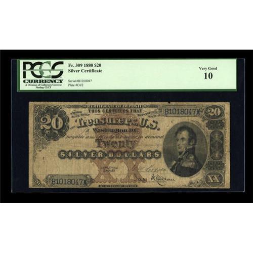 <B>Fr. 309 $20 1880 Silver Certificate PCGS Very Good 10.</B></I> Always a popular type note. This example, which is lightly toned, is new to the census.<BR><I>From The Kansas City Collection.</B></I><BR><BR><b>Shipping:</b> Coins & Currency (<a target="_blank" href="http://www.heritageauctions.com/common/shipping.php">view shipping information</a>)