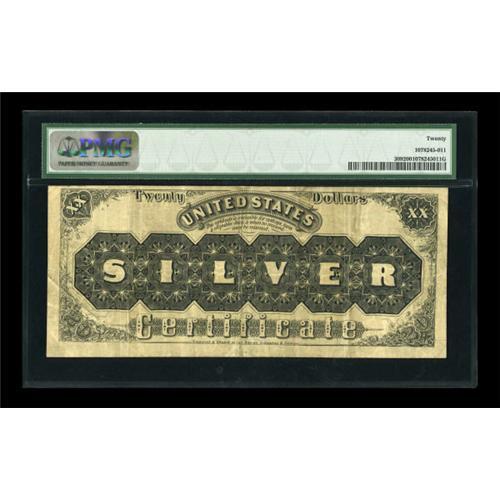 <B>Fr. 309 $20 1880 Silver Certificate PMG Very Fine 20.</B></I> One of the scarcer 1880 $20 Silver numbers, with just under 50 examples in the census. Track and Price auction records show no offerings about the EF grade. A very tough number to locate in any grade at all, and this is a rather handsome example. When even slightly circulated, the black ink on the back of this distinctive series tends to fade toward gray. Not so on this example, which, despite a fair degree of circulation, has retained its full ink color.<BR><I>From The John Ameen Collection</B></I><BR><BR><b>Shipping:</b> Coins & Currency (<a target="_blank" href="http://www.heritageauctions.com/common/shipping.php">view shipping information</a>)